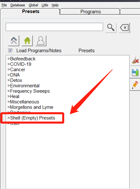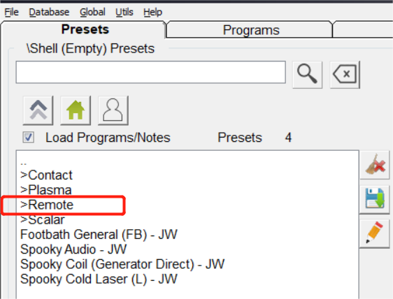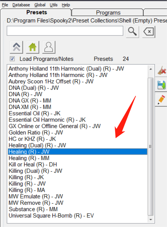 Open je Spooky2-software en selecteer Shell (Empty) Presets > Remote > Healing (R) – JW