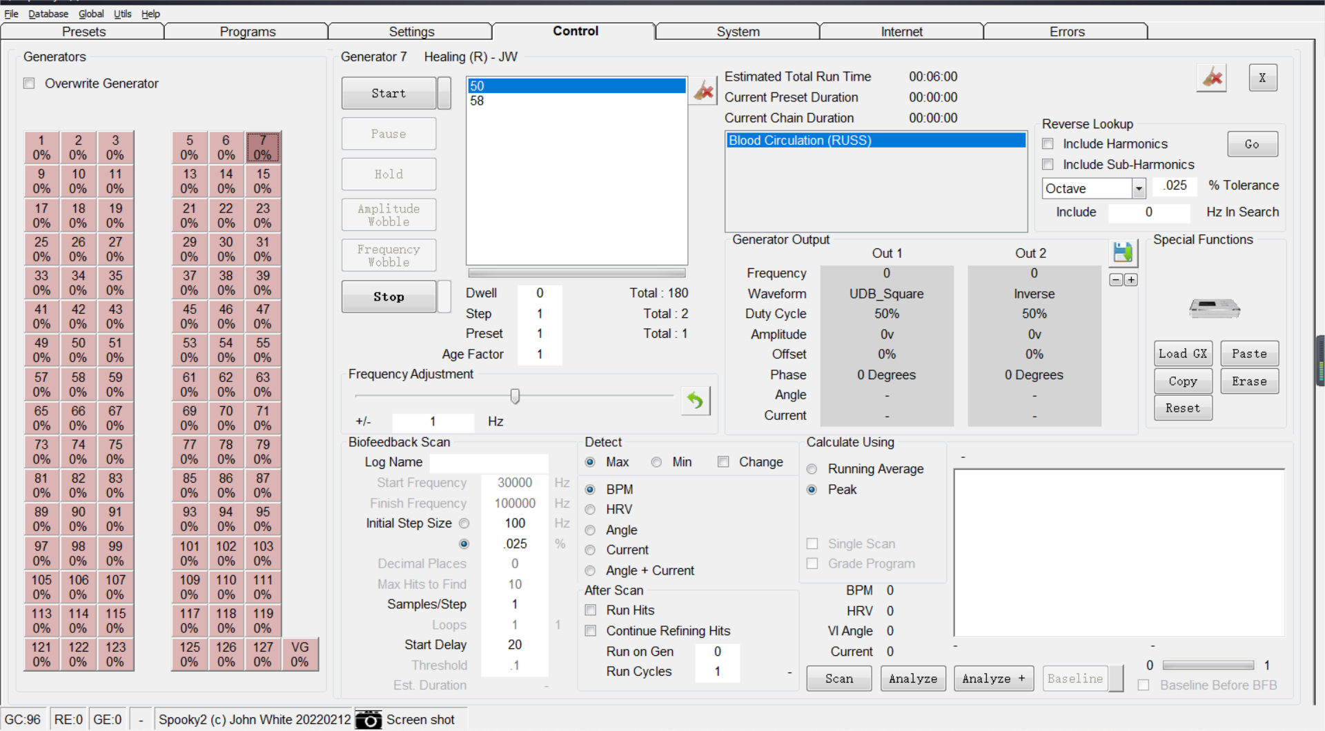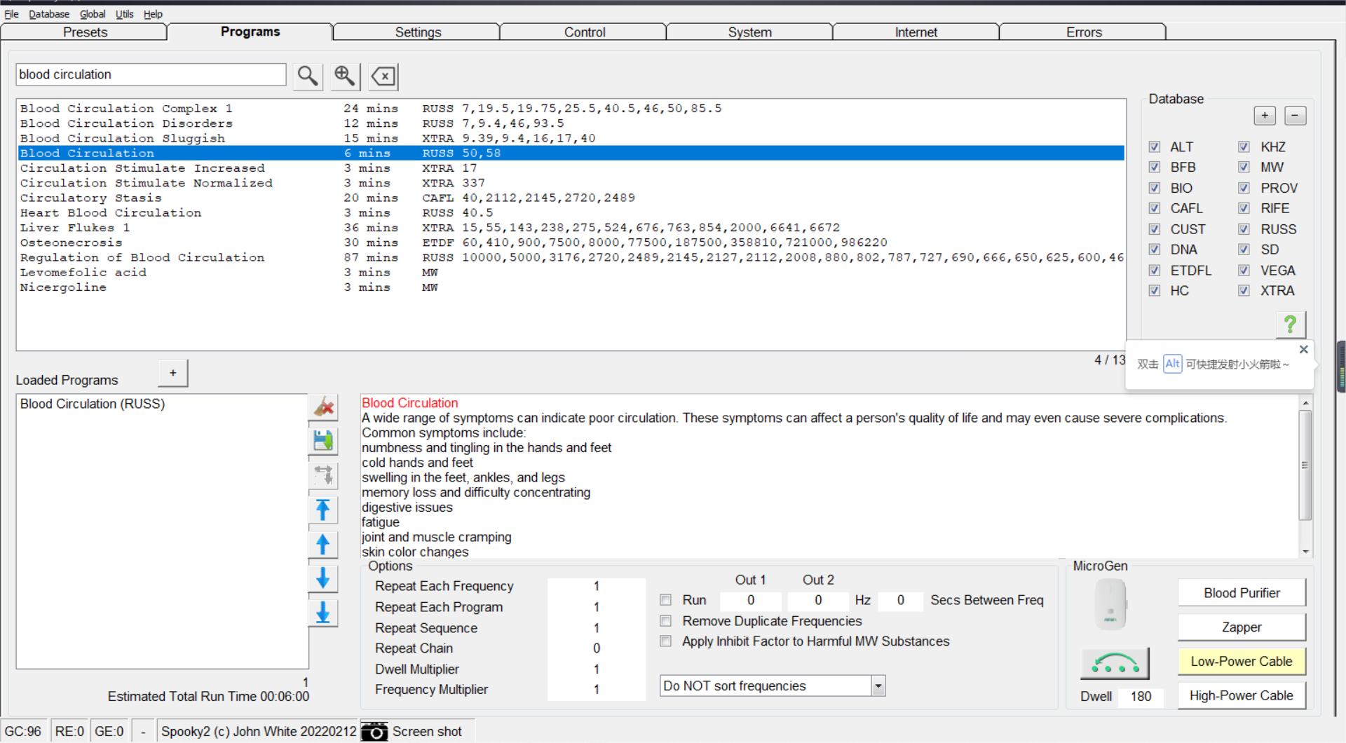 Je kunt bijvoorbeeld “blood circulation” intypen in de Spooky2 database, programma’s selecteren en ze uitvoeren in je Generator om je bloedsomloop te verbeteren.