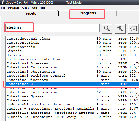 2. Selecteer je programma: Ga naar het tabblad Programs, zoek naar de bijbehorende orgaannaam (bijvoorbeeld ‘intestines‘) en kies het gewenste programma.