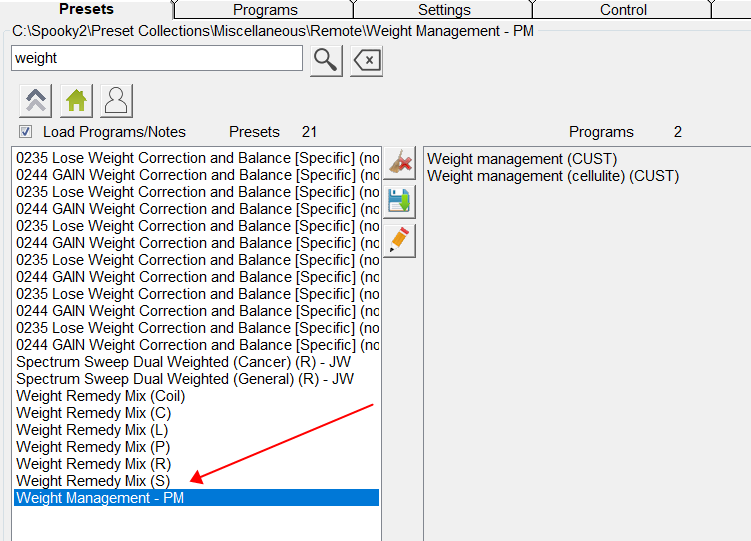 Start de Spooky2-software en voer deze trefwoorden in het zoekvak Presets/Programs in. De meest populaire voorinstelling voor gewichtsverlies is “Weight Management – PM”.