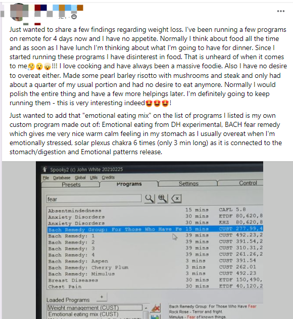 Sommige Spooky2-klanten geven toe dat gewicht-gerelateerde programma’s effectief zijn, maar ze melden ook dat hun eetlust behoorlijk toenam tijdens het uitvoeren van deze Presets/Programma’s. Een van de Spooky2-gebruikers besloot enkele emotie-presets/programma’s uit te proberen om voor het onder controle houden van haar eetlust, en ze slaagde er inderdaad in om gewicht te verliezen.