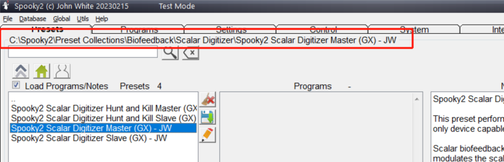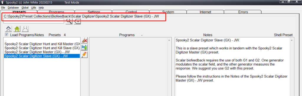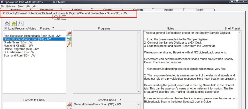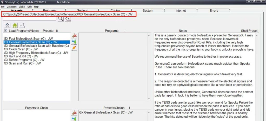 Open Spooky2 software en ga naar tabblad Presets > Biofeedback scan > GeneratorX.