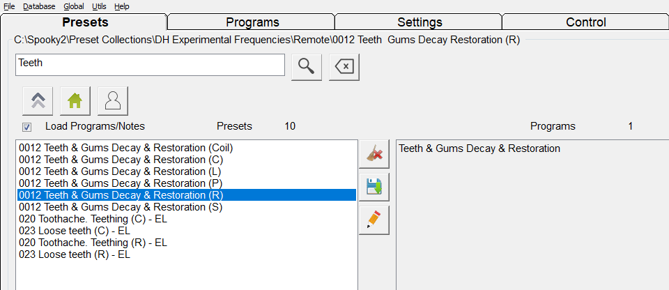 Zoek naar trefwoorden als “Teeth” of “Dental” in Spooky2Software en kies het juiste programma op basis van je symptomen.