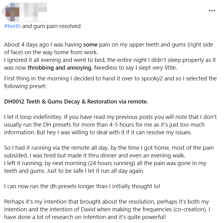 Na het gebruik van Spooky2’s Tooth Decay and Restoration presets, voorkwam de echtgenoot van een gebruiker een wortelkanaalbehandeling en zag een aanzienlijke verbetering in de gezondheid van zijn gebit.