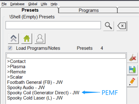 Spooky2 heeft talloze producten, elk met verschillende transmissiemodi en accessoires. Als je een Spooky2-kit als eerste aankoop hebt, kun je misschien kiezen uit Contact, Remote, Plasma, PEMF en Cold Laser. Alle programma’s zijn compatibel met deze transmissiemodi. Je moet er echter wel voor zorgen dat je de juiste preset kiest onder het tabblad Presets.