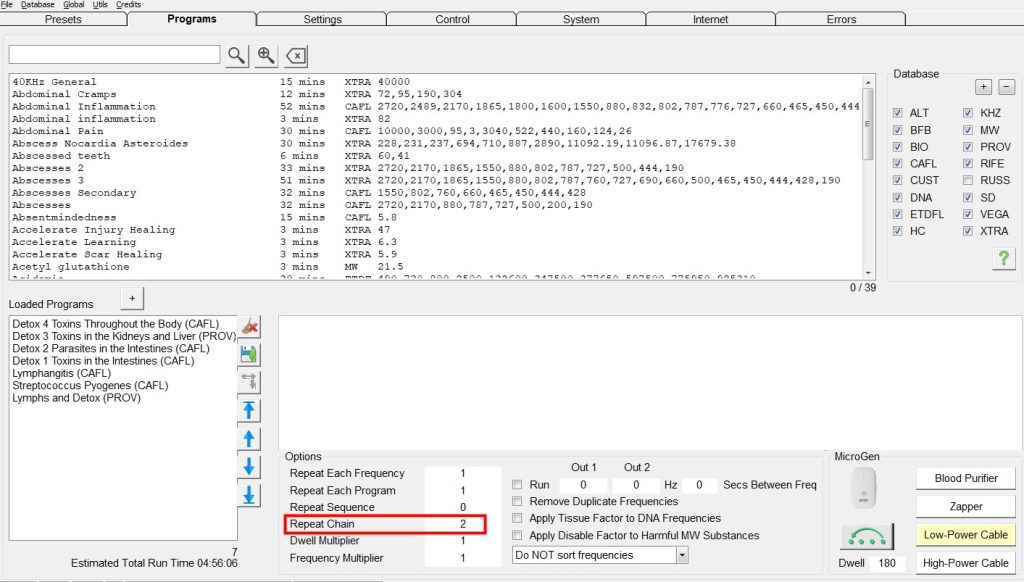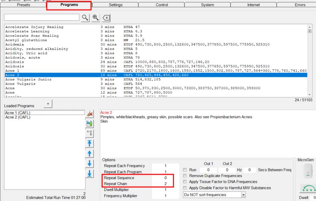 Stel bijvoorbeeld dat ik één generator wil gebruiken om eerst een Acne-preset en daarna een Detox-preset te draaien. De Acne-preset draait 8 uur en de Detox-preset draait 16 uur. Vervolgens stel ik in dat deze preset chain twee keer moet draaien.