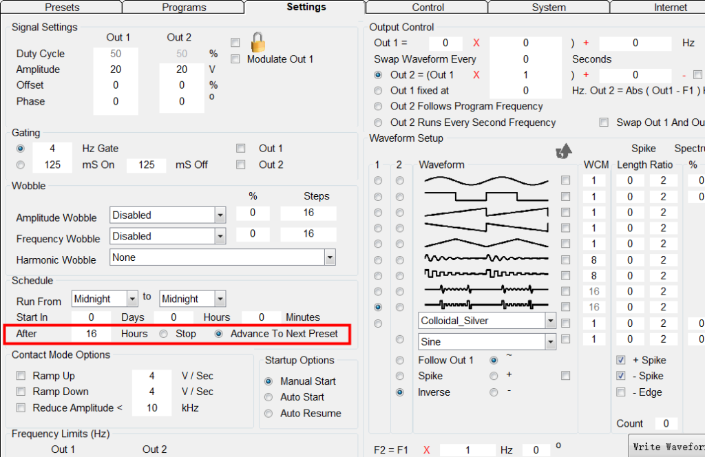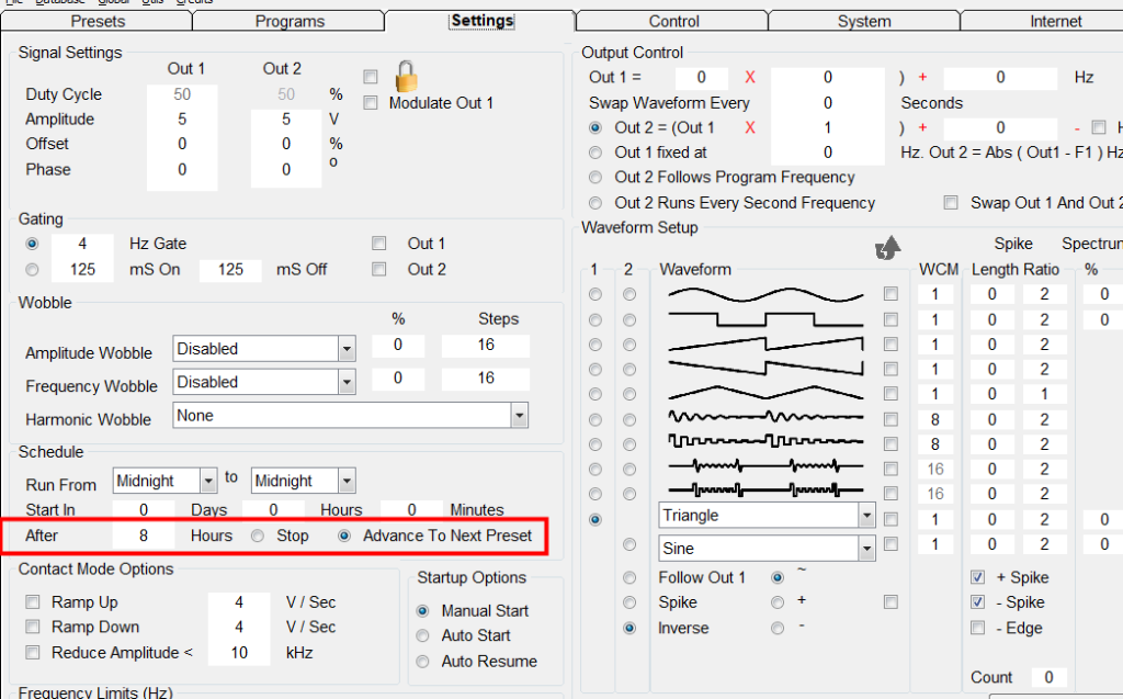Maak eerst één Acne-preset. Omdat ik wil dat de Acne Remote-preset 8 uur draait en de preset chain twee keer herhaald wordt, vul ik 0 in bij Repeat Sequence en 2 bij Repeat Chain. Ga daarna naar het tabblad Settings en vul 8 in bij Schedule. Nu kan ik de preset opslaan onder de naam “Acne-Amy”.