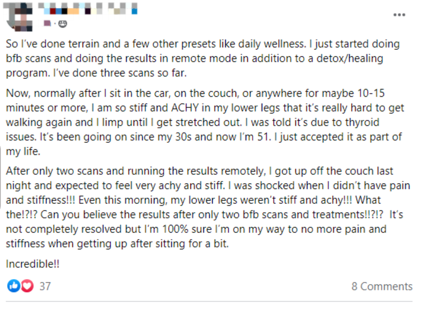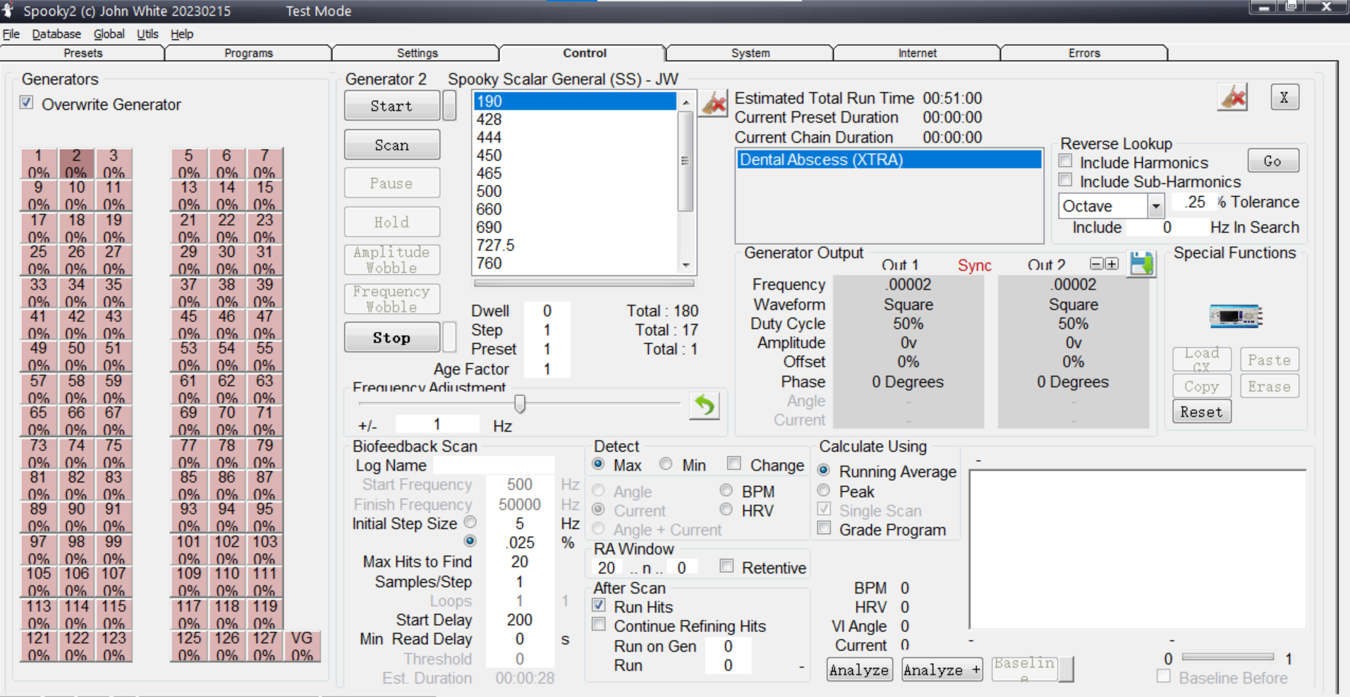 Ik moet Dental Abcess kiezen. Om 3 uur 's nachts ging ik de deur uit, op weg naar een ​​spoedtandarts. Ik had ondraaglijke pijn aan een knobbeltje op mijn tandvlees en kloppende kiespijn en een gezwollen wang. Als ik de tand zelf had kunnen trekken, had ik dat gedaan. Wetende dat hij alleen antibiotica en pijnstillers zou voorschrijven, die dagen nodig zouden hebben om te werken, startte ik mijn XM-generator op en vond en voerde het programma "Dental Abscess" uit. Om 11 uur, slechts acht uur later, was de knobbel helemaal weg, de pijn was helemaal weg en het voelde alsof ik nooit kiespijn had gehad. Die tand was absoluut in orde en sindsdien heb ik er geen probleem meer mee gehad. Het was als een wonder. Ik heb hem sindsdien voor andere dingen gebruikt, maar ik zal voor altijd dankbaar zijn dat het destijds de pijn wegnam die veel erger was dan ‘een 10’.