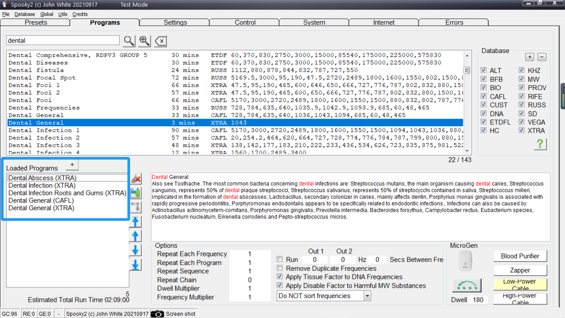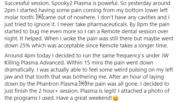 Vandaag rond 16.00 uur besloot ik dezelfde frequenties te gebruiken met de JW Killing en Plasma Advanced. Binnen 15 minuten nam de pijn drastisch af. Ik voelde een vreemd kloppend gevoel in mijn linker onderkaak en in de kies waar ik last van had. Na een uur met de Phanotron Plasma bol was de pijn helemaal weg. Besloten om de 2 uur durende sessie wel af te maken. Plasma is legitiem! Ik heb een foto bijgevoegd van de programma’s die ik heb gebruikt. Fijn weekend!”