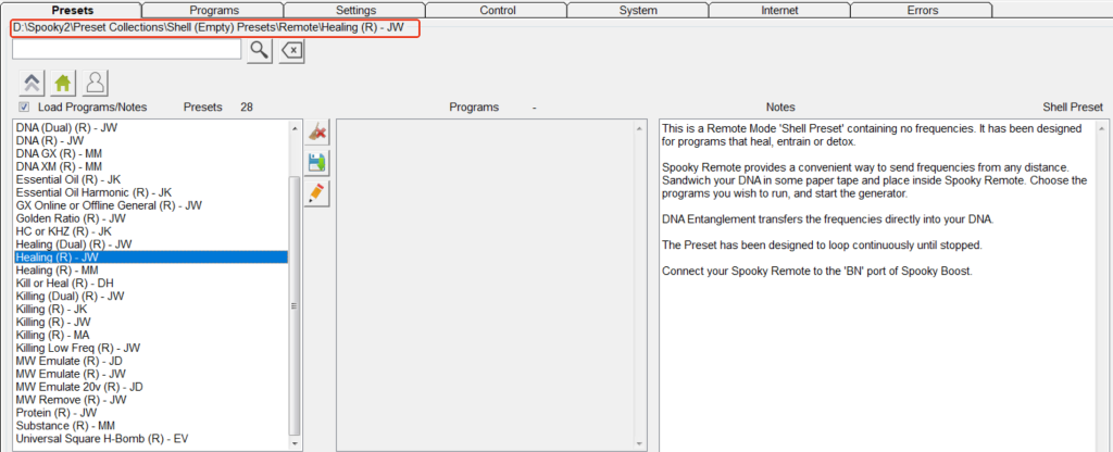 Open je Spooky2 software en kies Shell (Empty) Presets > Remote > Killing (R) – JW.