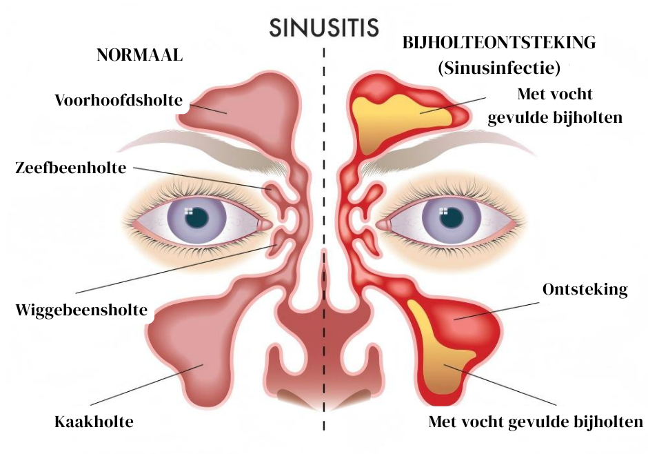 Sinusitis ontstaat wanneer het slijmvlies van één of meer sinusholten ontstoken en gezwollen raakt. Onder normale omstandigheden wordt slijm via kleine kanaaltjes naar de neusholte afgevoerd. Wanneer deze kanaaltjes geblokkeerd zijn, kan slijm vast komen te zitten, wat ideale omstandigheden creëert voor bacteriën of virussen om zich te vermenigvuldigen en aanhoudend ongemak te veroorzaken.