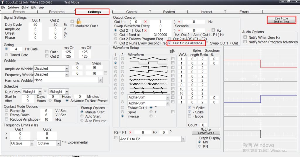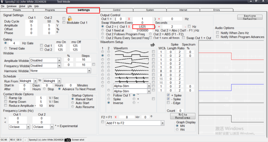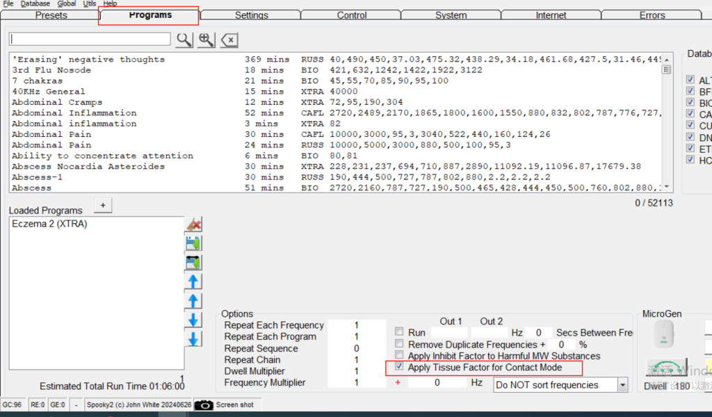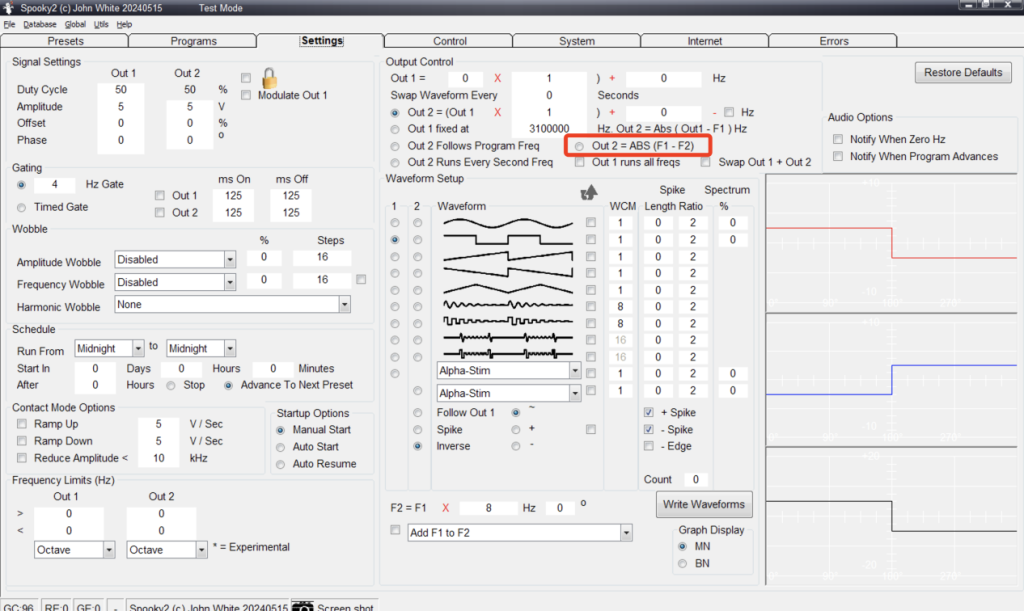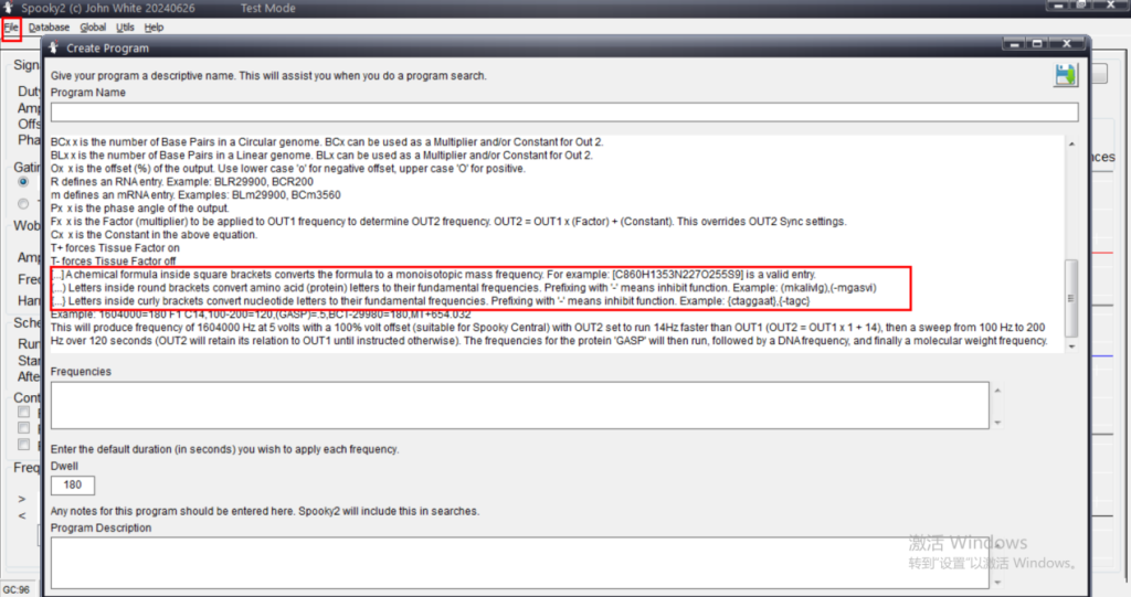 Om een eiwit te remmen, begin je de reeksmet “-“; bijvoorbeeld “(-mkaliv….) Spooky converteert elk aminozuurkarakter naar de bijbehorende frequentie.