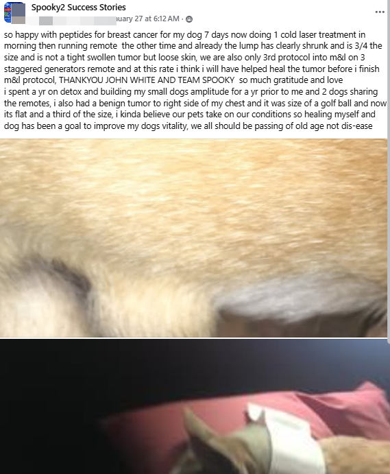 Ik ben zo blij met peptiden voor borstkanker bij mijn hond. Het is nu zeven dagen geleden dat ik ’s ochtends één cold laserbehandeling heb gedaan en daarna op Remote heb behandeld, en de knobbel is al duidelijk gekrompen tot 3/4 van de oorspronkelijke grootte. Het is geen strakke, gezwollen tumor meer, maar losse huid. We zijn ook pas bij het derde protocol in M&L op 3 verspreide generatoren op Remote, en in dit tempo denk ik dat ik de tumor zal hebben helpen genezen voordat ik het M&L-protocol heb voltooid.