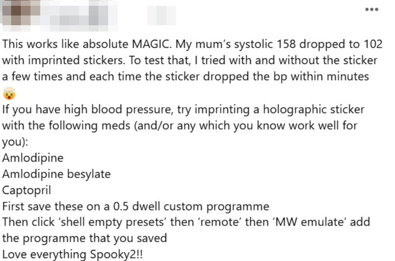 Dit werkt als absolute MAGIE. De systolische waarde van mijn moeder van 158 daalde naar 102 met de geprinte stickers. Om dit te testen heb ik een paar keer geprobeerd met en zonder sticker, en elke keer zorgde de sticker ervoor dat de bloeddruk binnen enkele minuten daalde 🤯