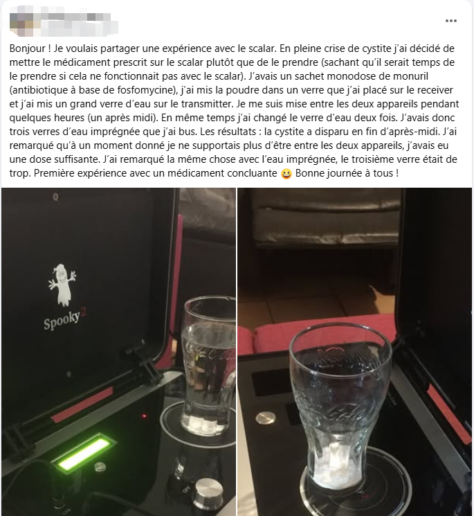 Midden in een cystitis-opvlamming besloot ik de voorgeschreven medicatie op de scalar te plaatsen in plaats van in te nemen (wetende dat ik nog tijd had om het in te nemen als het niet zou werken met de scalar). Ik had een eenmalige dosis Monuril (een antibioticum op basis van fosfomycine); ik deed het poeder in een glas dat ik op de zender plaatste, en ik zette een groot glas water op de ontvanger. Ik ging zelf enkele uren tussen de twee apparaten zitten (een middag).