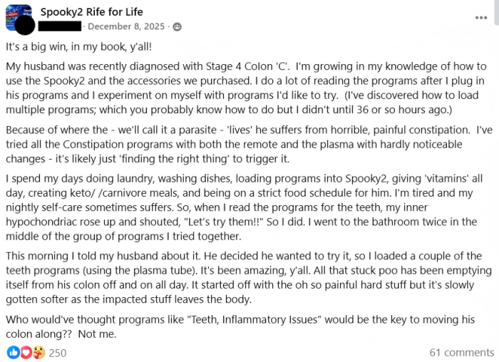 Bij mijn man is onlangs stadium 4 darm ‘C’ vastgesteld. Ik groei nog steeds in mijn kennis van hoe ik Spooky2 en de accessoires die we hebben gekocht moet gebruiken. Ik lees veel over de programma’s nadat ik zijn programma’s heb geladen en experimenteer met mezelf met programma’s die ik wil proberen. (Ik heb ontdekt hoe je meerdere programma’s kunt laden; wat jullie waarschijnlijk al wisten, maar ik pas ongeveer 36 uur geleden ontdekte.) Omdat op de plek waar de — laten we het een parasiet noemen — “woont”, heeft hij last van vreselijke, pijnlijke constipatie. Ik heb alle Constipation-programma’s geprobeerd met zowel de remote als de plasma, maar er waren nauwelijks merkbare veranderingen — waarschijnlijk is het gewoon een kwestie van de juiste trigger vinden. Ik besteed mijn dagen aan de was doen, afwassen, programma’s in Spooky2 laden, hem de hele dag ‘vitamines’ geven, keto/carnivore maaltijden maken en hem op een strikt voedingsschema houden.