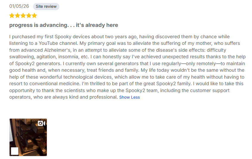 Ik kocht mijn eerste Spooky-apparaten ongeveer twee jaar geleden, nadat ik ze toevallig ontdekte tijdens het luisteren naar een YouTube-kanaal. Mijn voornaamste doel was om het lijden van mijn moeder, die aan vergevorderde Alzheimer lijdt, te verlichten, in een poging enkele bijwerkingen van de ziekte te verminderen: slikproblemen, agitatie, slapeloosheid, enz. Ik kan eerlijk zeggen dat ik dankzij de hulp van Spooky2 generators onverwachte resultaten heb bereikt.