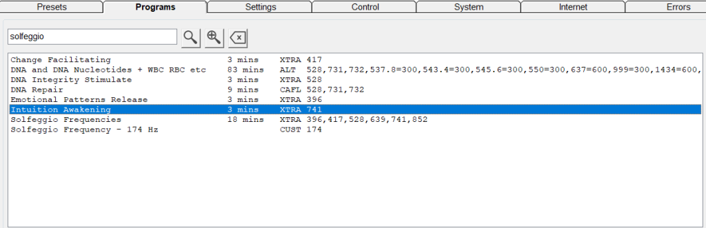 Open Spooky2 software. Ga naar het tabblad Presets en klik op Shell (Empty) Presets\Scalar en selecteer dan Spooky Scalar General (SS)-JW. Zoek “solfeggio” in de tab Programs. Dubbelklik op het gemarkeerde programma.